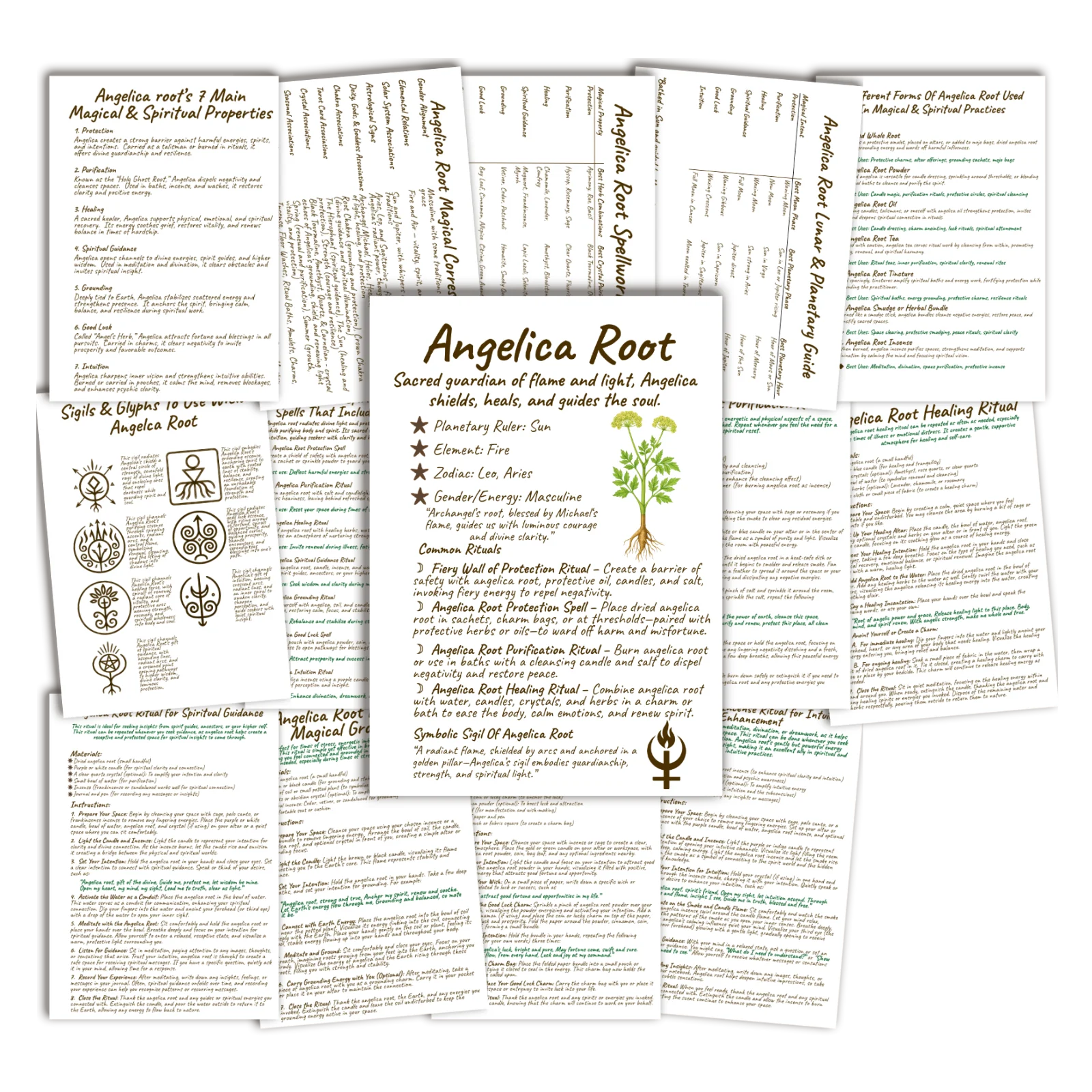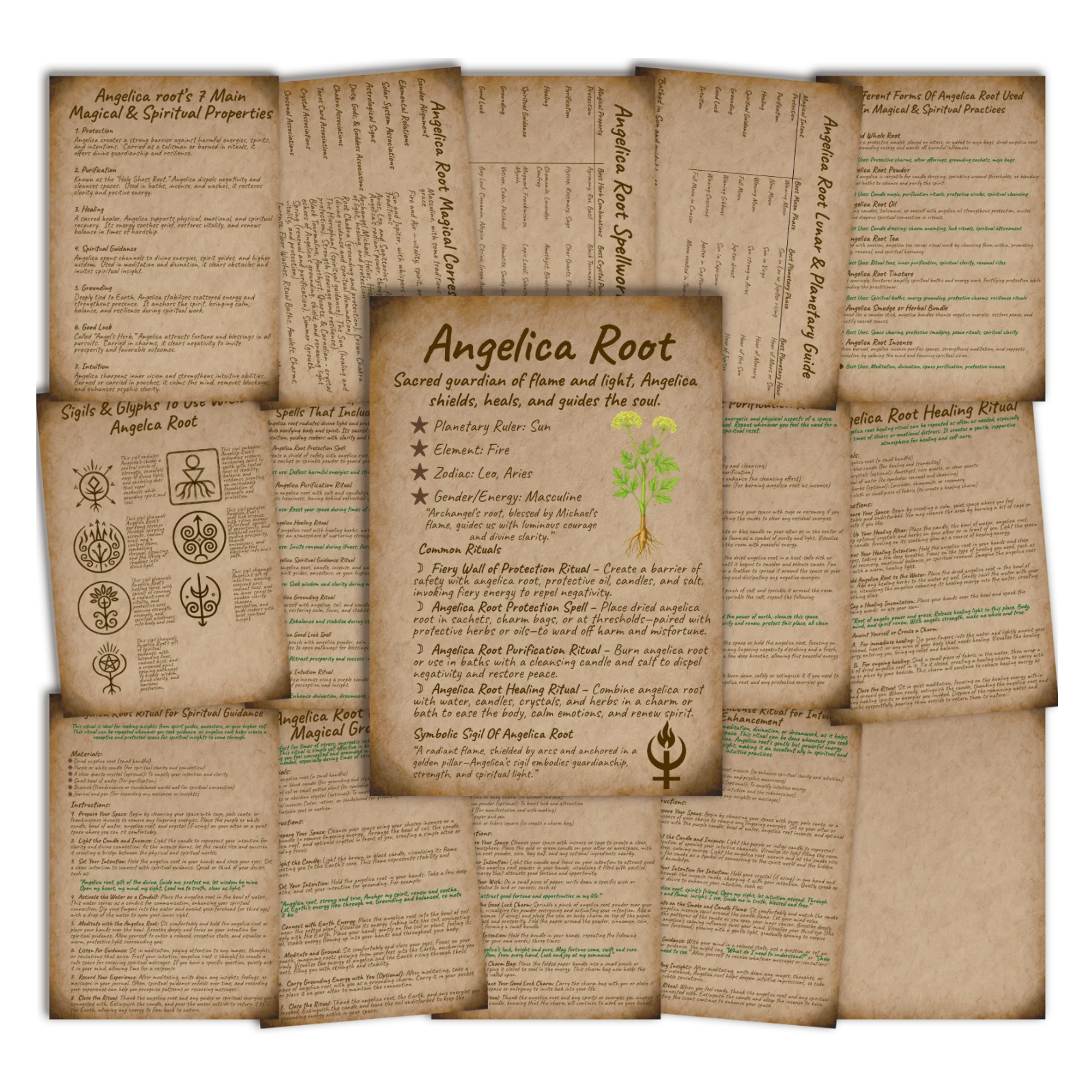 Illuminate your craft with the radiant, protective magic of Angelica Root, a sacred herb long revered as Holy Ghost Root and Archangel Root for its power to shield, purify, heal, and guide the spirit. Steeped in centuries of folk magic and spiritual reverence, Angelica Root carries the warming fire of the Sun, the protective clarity of Archangel Michael, and the grounding strength of Earth. This beautifully handwritten Angelica Root Grimoire captures that luminous heritage across an entire collection of premium Book of Shadows pages designed to look authentically old-world, richly textured, and ritual-ready.